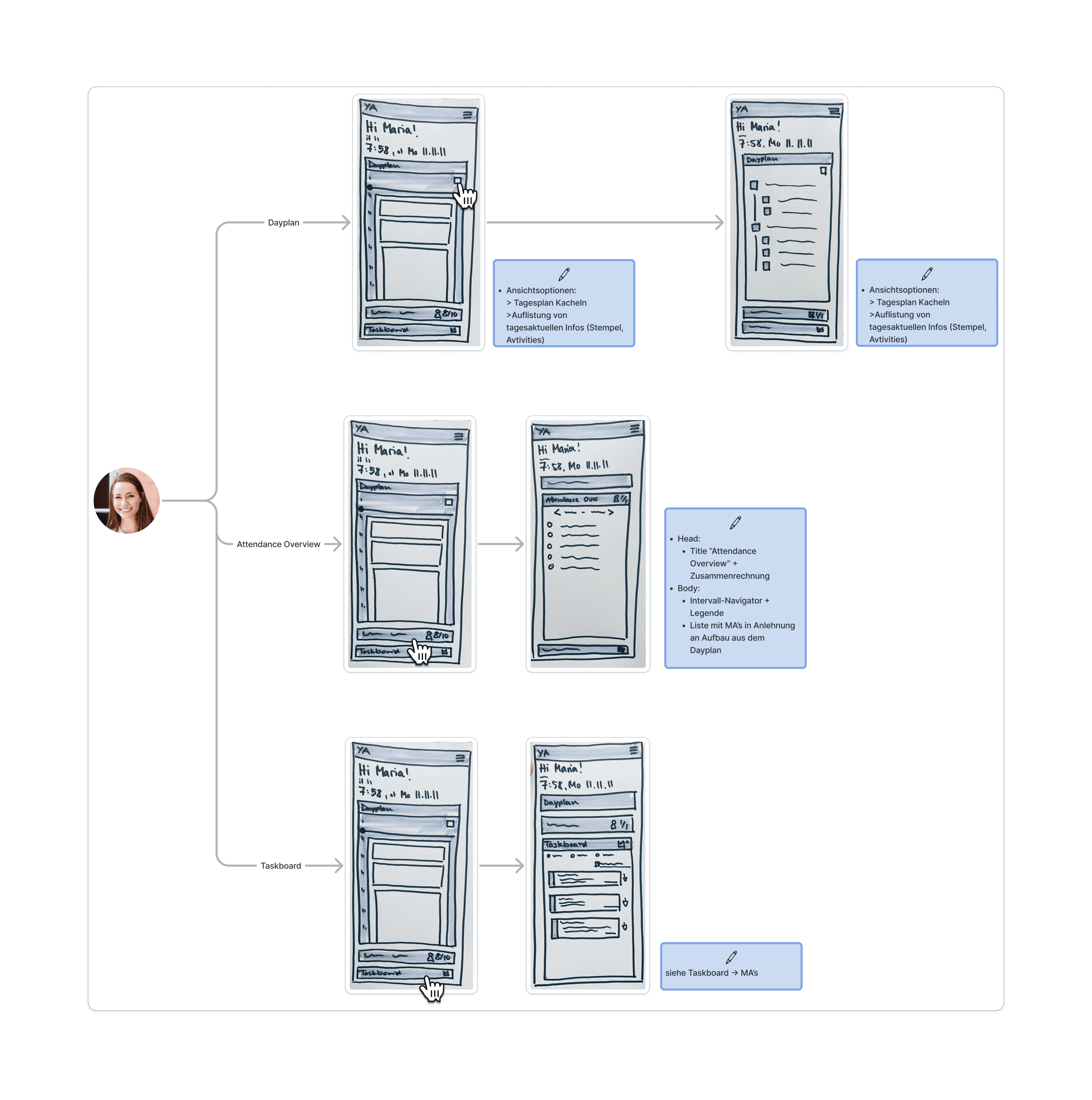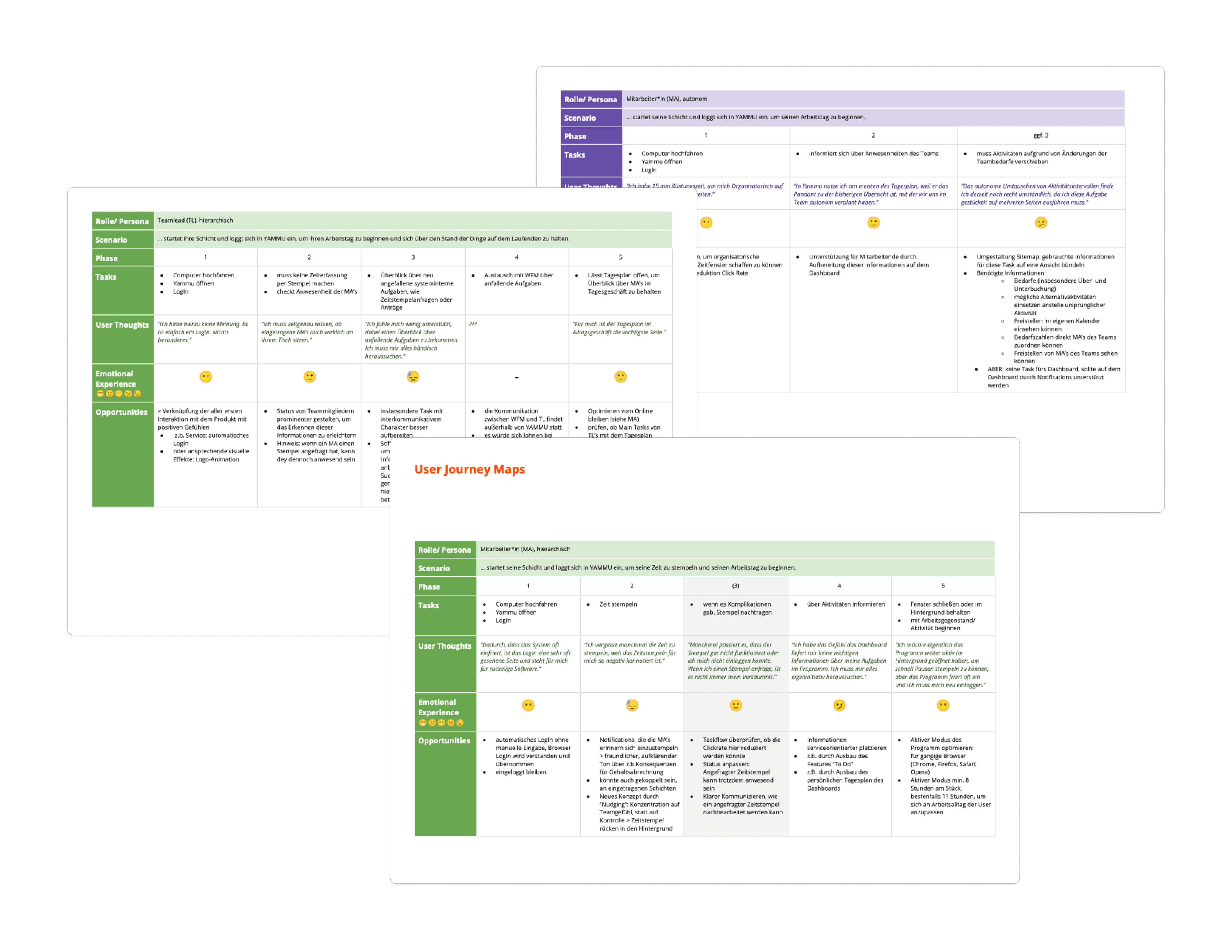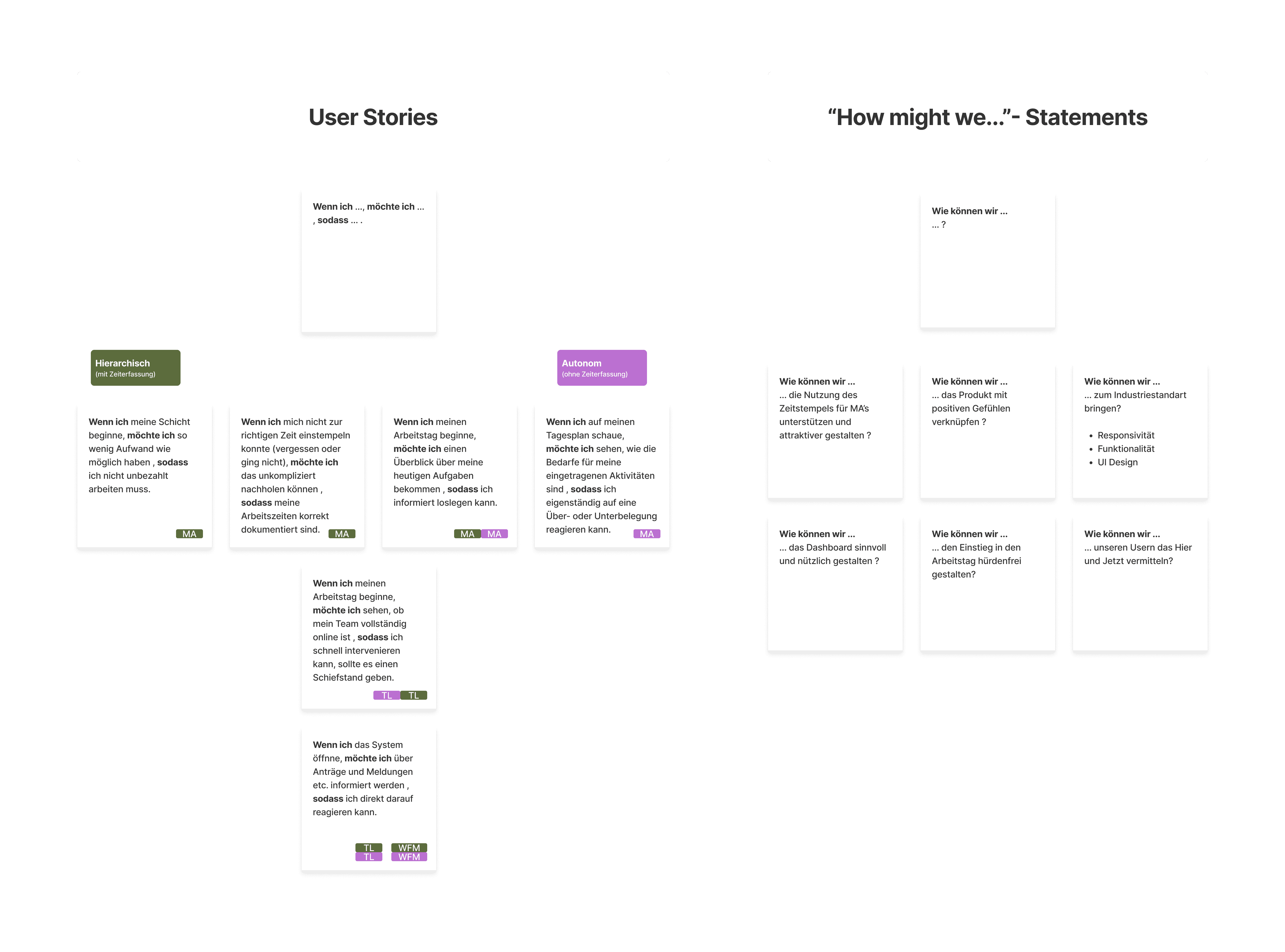During this process, I noticed that the available information regarding the manager (WFM) role was still too superficial to derive meaningful design decisions from it. Since no additional user research was planned for this project cycle, I decided — in alignment with the Product Owner — to focus in this cycle on the employee (MA) and team lead (TL) roles.