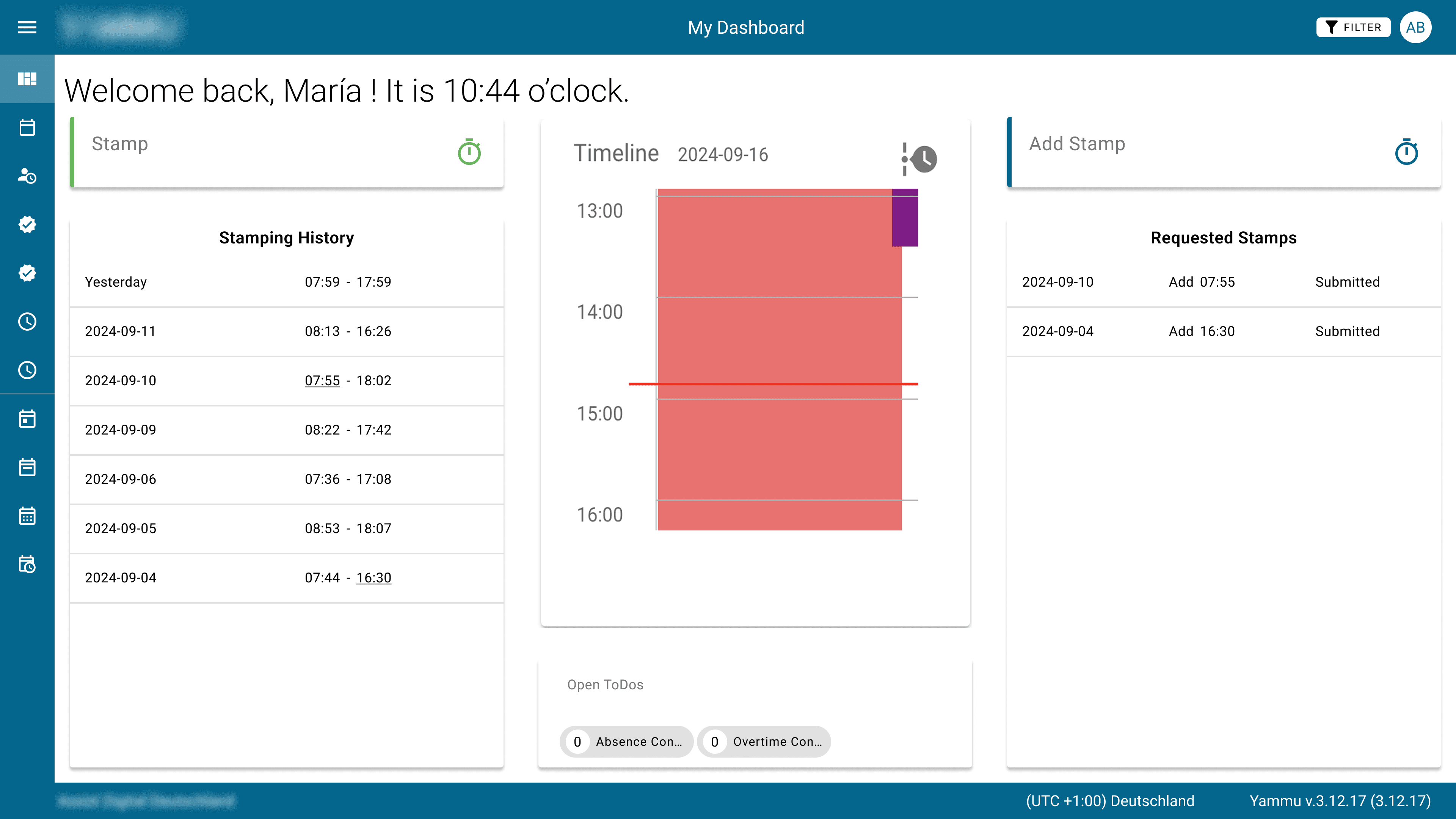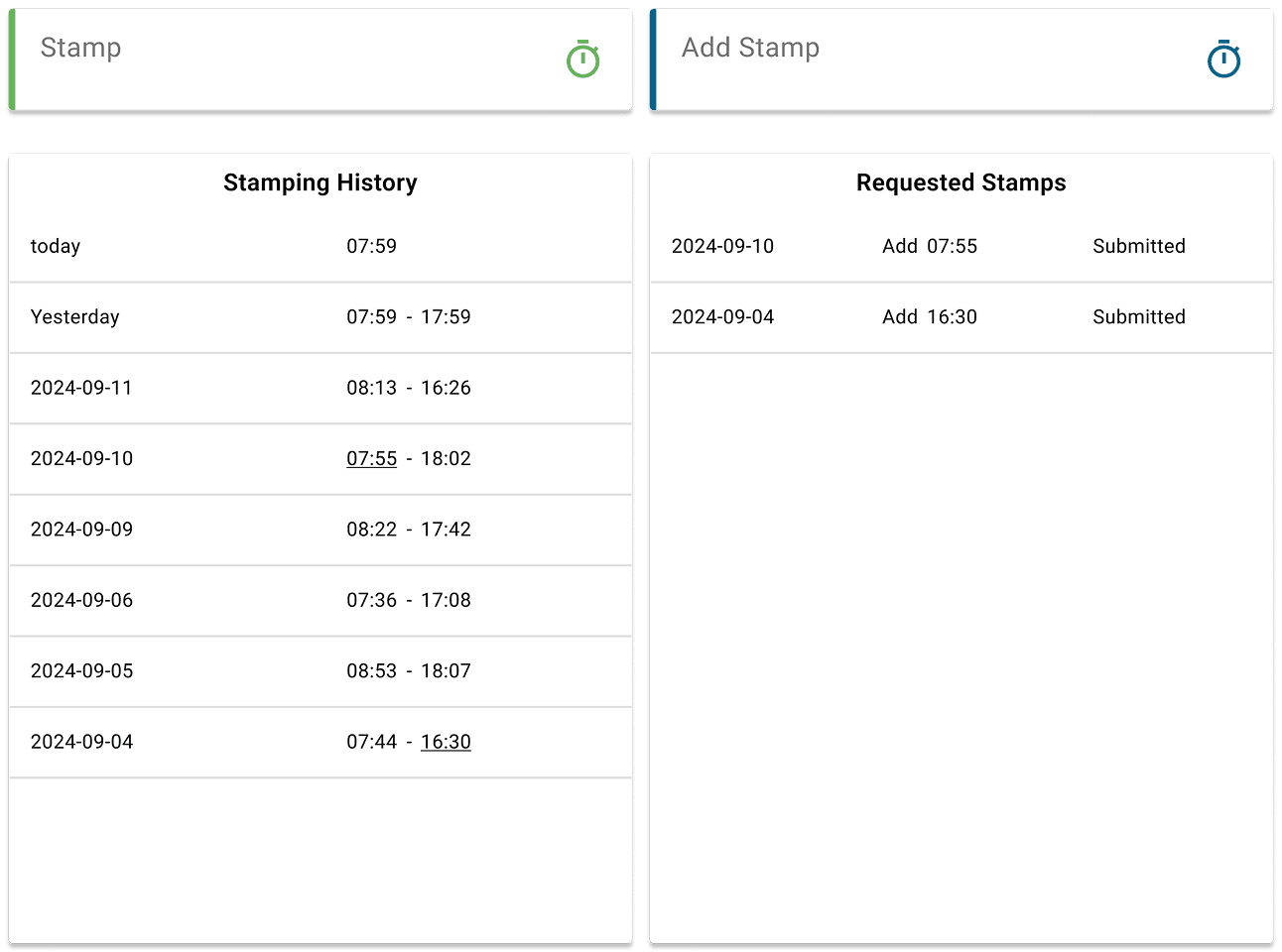 Let’s start with the version closest to the original application: the dashboard for employees in the hierarchical shift-distribution model. As a reminder, this user group recorded their working hours by clocking in and out within the system.