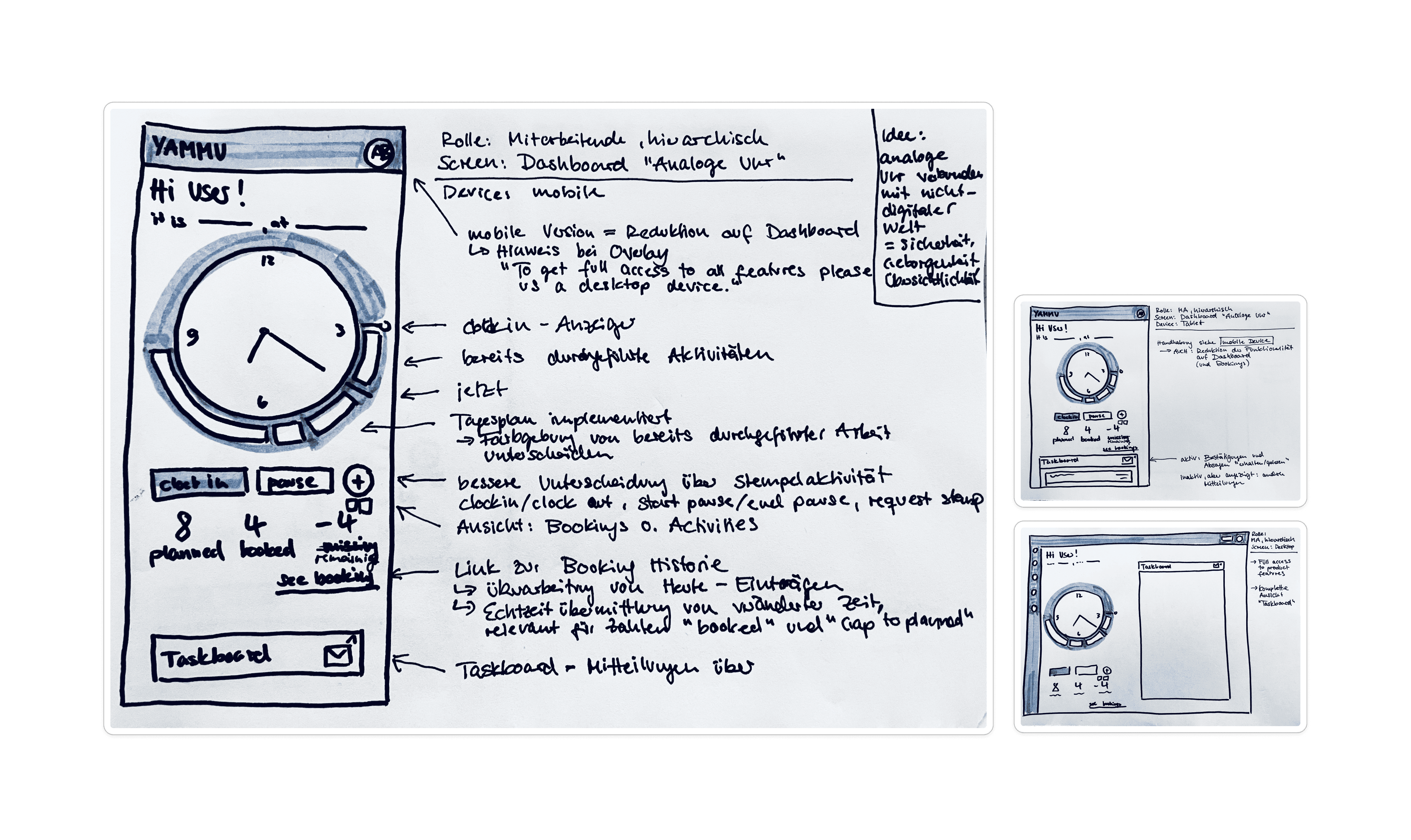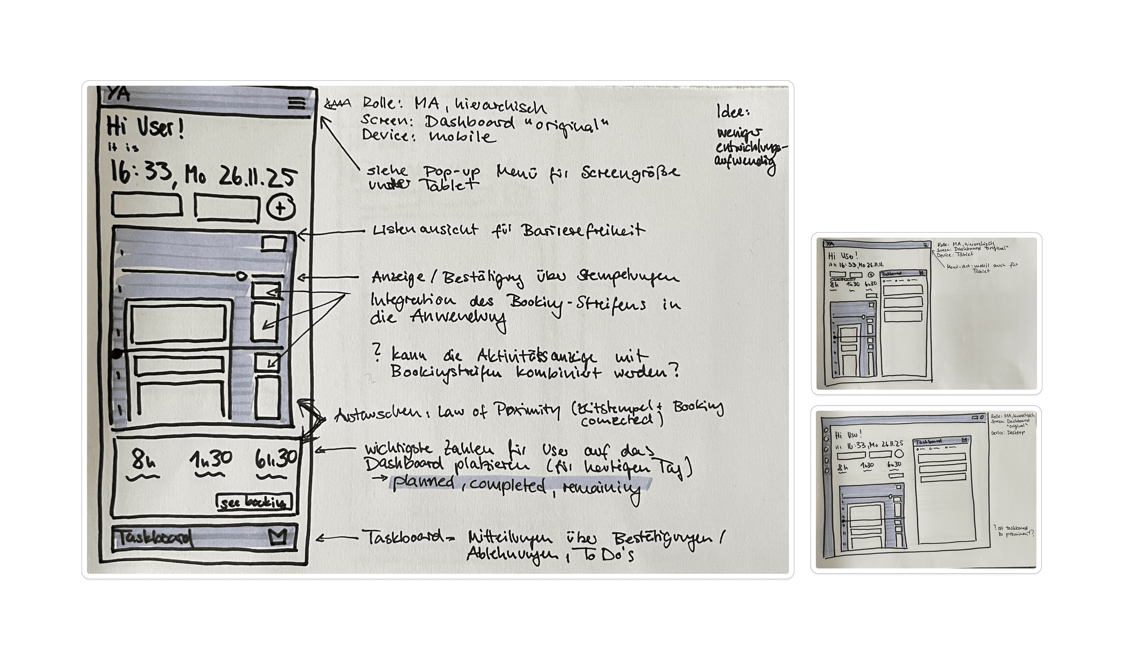 For this concept, I used my favorite tools — pen and paper. Still the best way to think (and even scientifically proven!). I also followed a mobile-first approach. Although the product had mainly been used on desktop so far, the user interviews clearly showed a demand for a mobile version. So it made perfect sense.
